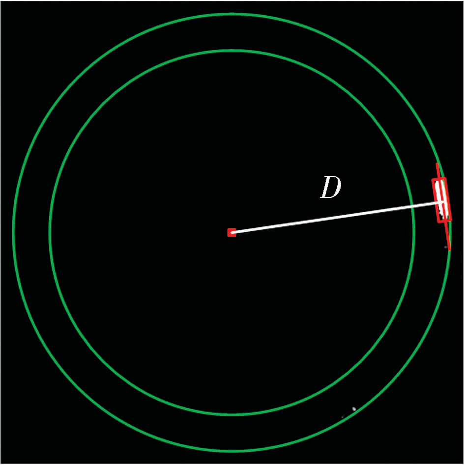 提取出缺陷后,計算該缺陷的區(qū)域面積S與區(qū)域輪廓長度L,如果缺陷面積與輪廓長度皆未超過設(shè)定閾值,則視為無此類型缺陷轉(zhuǎn)而進行下一缺陷的識別;否則進一步計算最小外接矩形主軸至小圓圓心的距離,由于車廢細化后呈圓弧形,故圓心至主軸的距離會大于小圓半徑,所以將小圓半徑設(shè)為距離閾值TD,若距離D超過閾值TD則將此套圈判定為車廢缺陷。