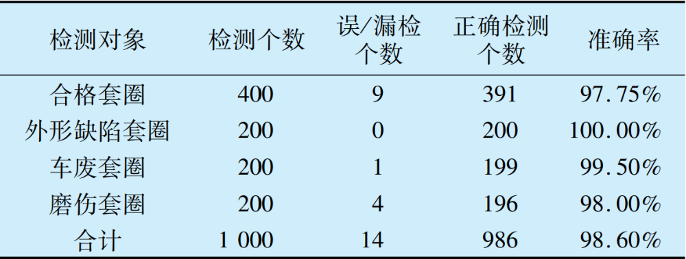 另外,對不同型號的套圈也進行了多次檢測,識別準確率較高,誤漏檢率較低,響應(yīng)時間較短,并能實時統(tǒng)計被檢測套圈的型號、數(shù)量、合格率、缺陷種類等數(shù)據(jù),滿足企業(yè)生產(chǎn)在線檢測要求,可以替代人工實現(xiàn)檢測。