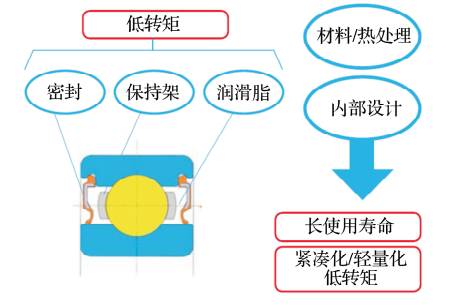 通過材料、熱處理、內(nèi)部設計參數(shù)的變化以及諸如密封、保持架、潤滑脂的改進(圖1),實現(xiàn)低轉(zhuǎn)矩的要求和緊湊化、輕量化的設計。