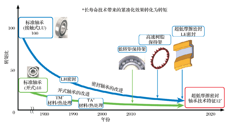 不同類型深溝球軸承的結(jié)構(gòu)和性能特點見表1。通過比較轉(zhuǎn)矩,自20世紀80 年代以來深溝球軸承的技術史如圖2所示。