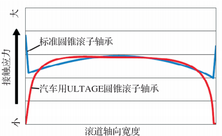 圓錐滾子軸承滾動接觸區(qū)域的接觸應力最小化,并在滾子上采用特殊凸形減小接觸區(qū)域邊緣處過大的應力(邊緣載荷)。滾道軸向截面接觸應力分布計算示例如圖8所示。隨著ULTAGE圓錐滾子軸承在汽車上的應用,通過采用特殊凸形抑制接觸區(qū)域的邊緣載荷和均衡整體接觸應力分布,提高軸承使用壽命。