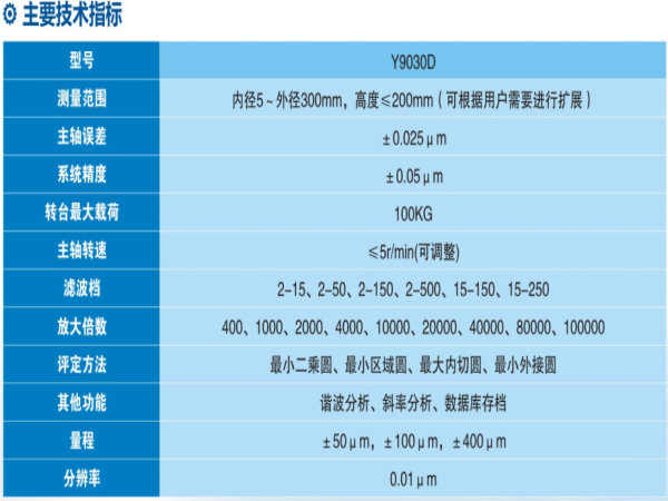 Y90D系列圓度測量儀是以大承重高精度氣浮主軸為基準,采用計算機測量系統(tǒng)的轉臺式通用型圓度儀,適用于大型回轉體工件的的圓度、波紋度、同軸度等參數的測量,主要應用于大型精密機械制領域。儀器主要由氣浮主軸、精密調平調心工作臺、花崗巖臺面和立柱、高精度電感測頭、精密旋轉編碼器、驅動控制電箱、高精度測量電箱、空氣過濾干燥系統(tǒng)以及基于windows XP的專用測量分析軟件組成。
